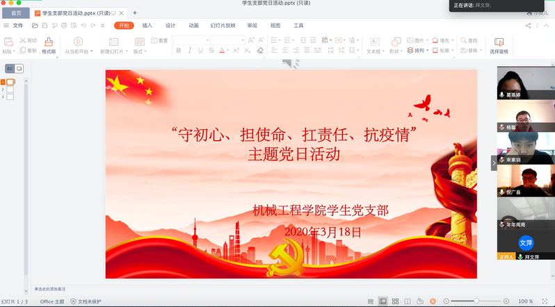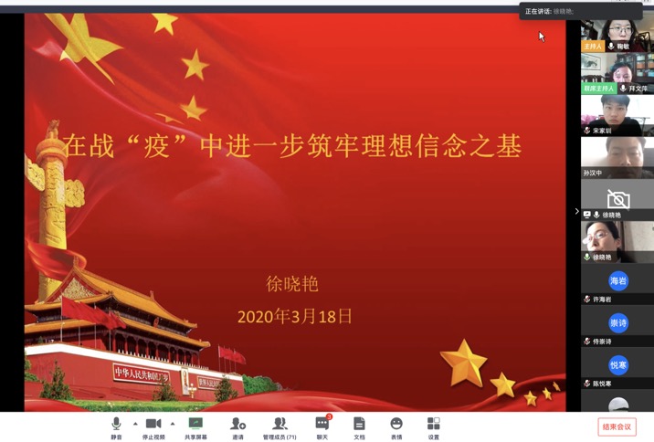 3月18日下午,威尼斯7798cc学生党支部在线开展了“守初心、担使命、扛责任、抗疫情”线上主题党日活动。