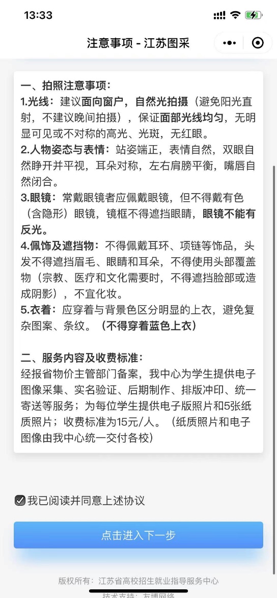 经报省物价主管部门备案,省招就中心将为学生提供电子图像采集、实名验证、后期制作、排版冲印、统一寄送等服务;为每位学生提供电子版照片和5张纸质照片;收费标准为15元/人(纸质照片和电子图像由省招就中心统一交付学校),在线提交照片时完成交费。