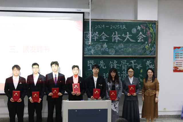 学院团委书记张振兴介绍了学院团学组织建设和青年学生骨干培养情况,回顾和总结了上一学年学院共青团工作的开展情况;学工办主任拜文萍宣读了新一届团学干部任用名单;学生会主席孟响同学代表学院团委和学生会做了下阶段工作规划,并代表全体团学干部做表态发言;与会领导和老师共同为团学干部代表颁发了聘书。